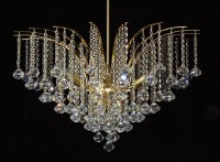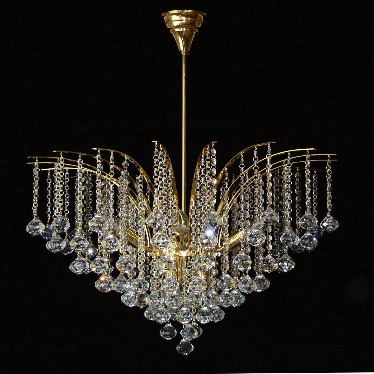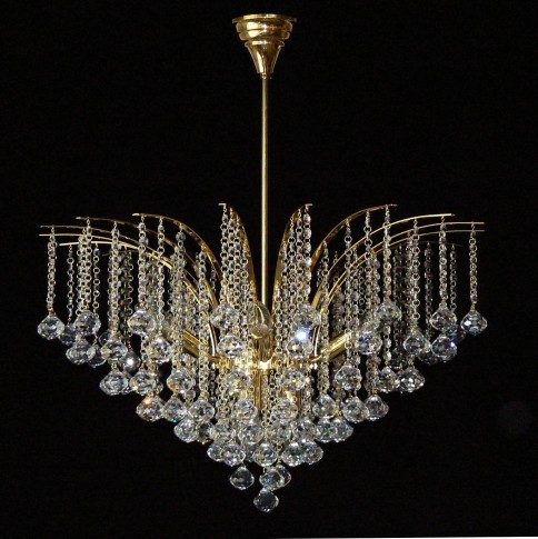Glittering chandelier in the shape of a brass crown decorated with crystalballs (Preciosa 32% PbO). An interesting decorative lamp for a residential interior.