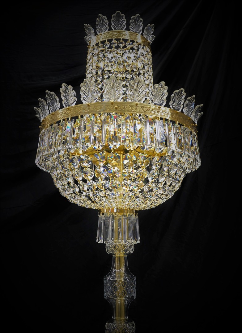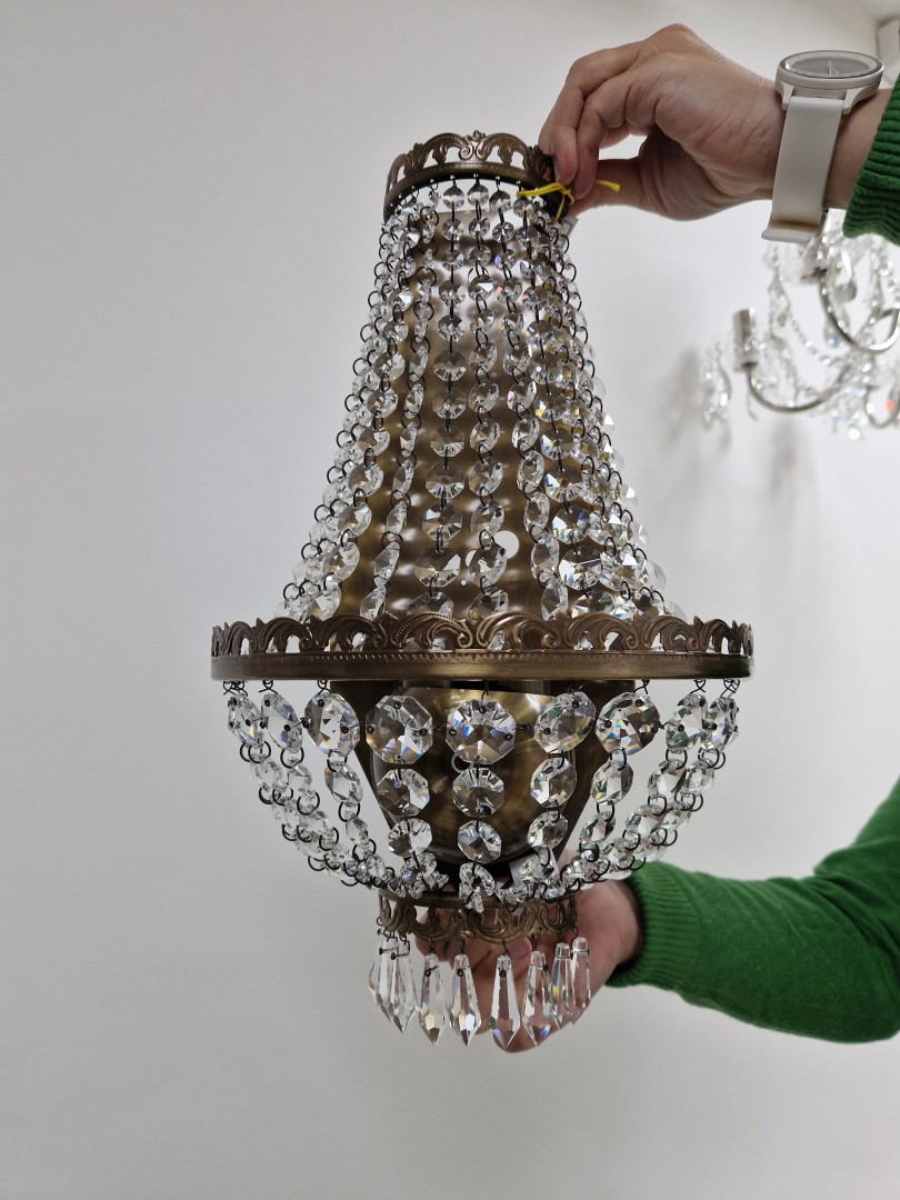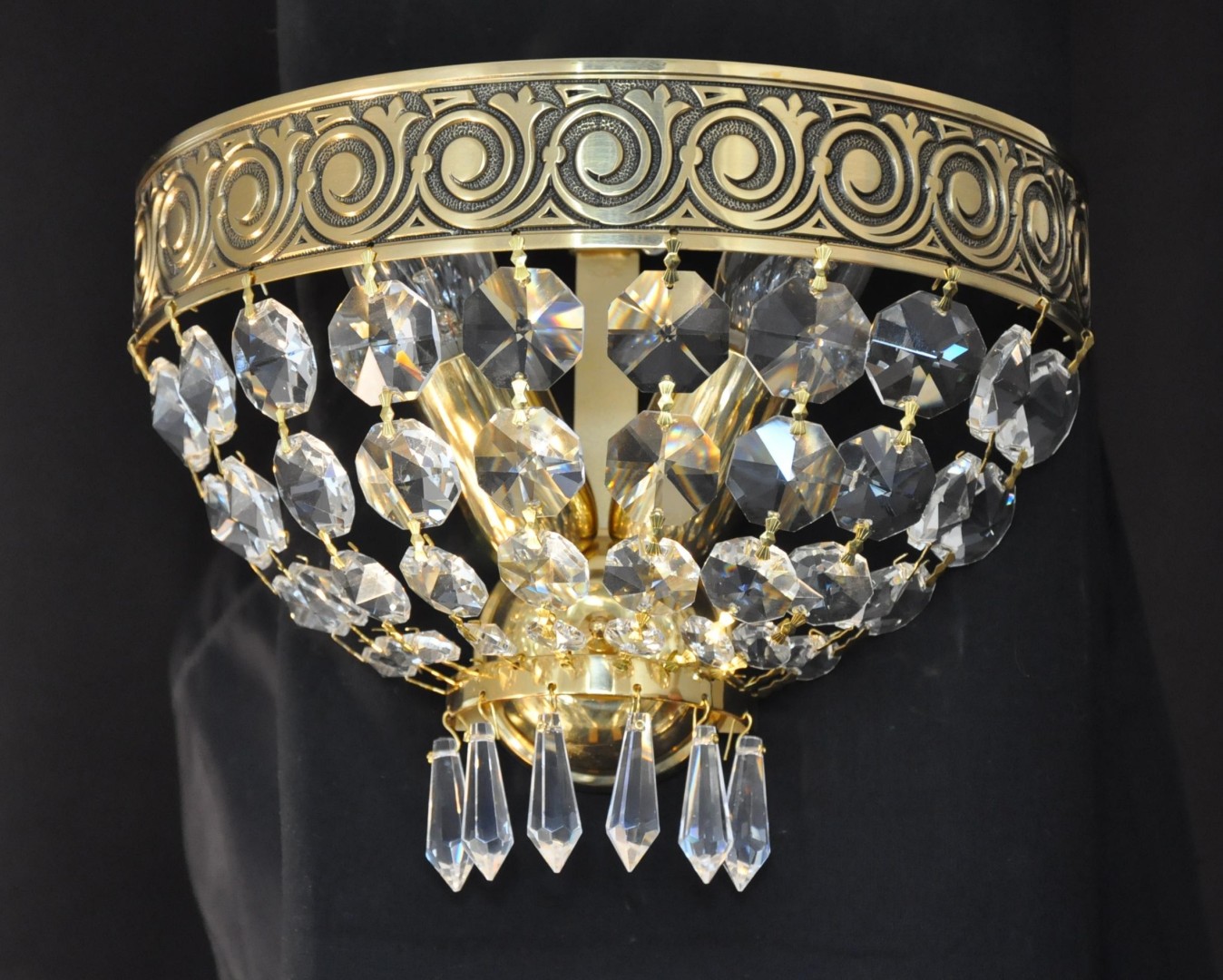 Diese kleinen Wandleuchten sind aus dem gleichen Material wie ihre größeren Deckenleuchten gefertigt, d.h. aus dem gleichen Messingband, der gleichen Metalloberfläche (matt, poliert, gebeizt, beschichtet), den gleichen dekorativen Metallornamenten, der gleichen Art von Kristallsteinen, usw.