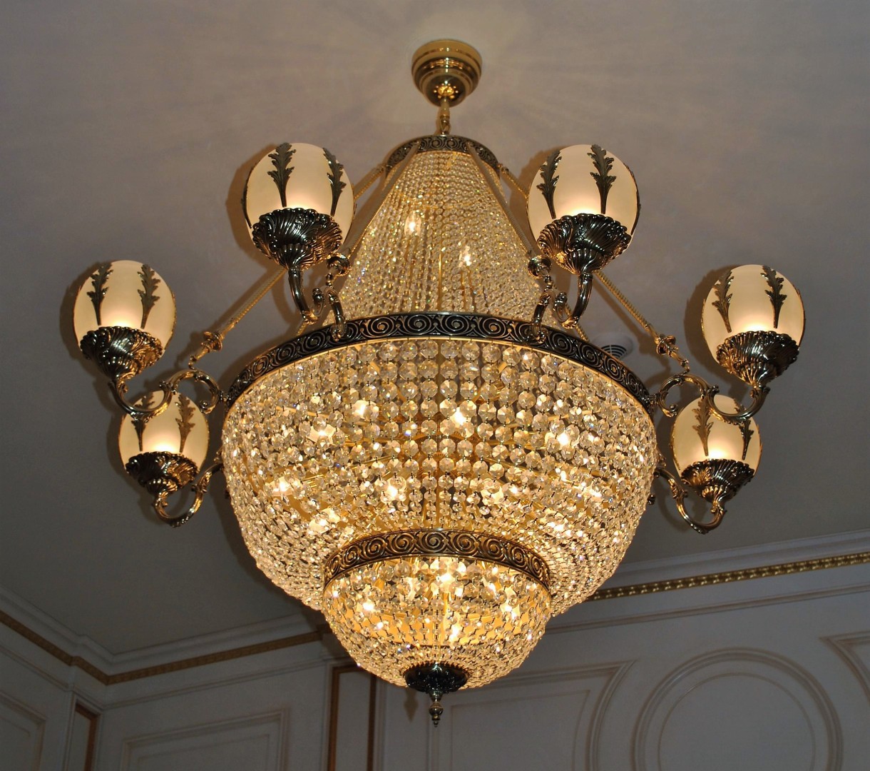 Ein Beispiel für mehrere kleine Strass-Wandleuchten, die die größeren Deckenleuchten perfekt ergänzen.