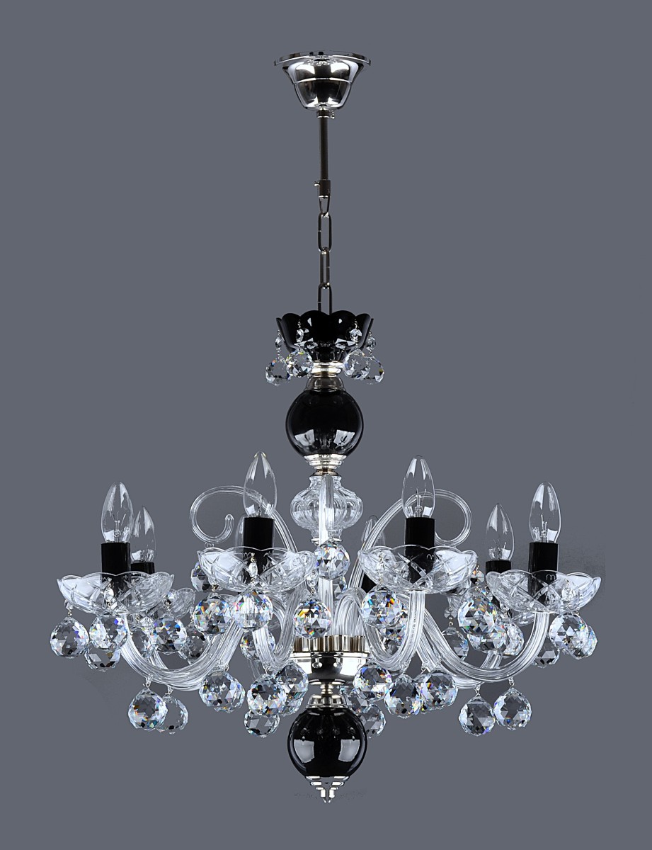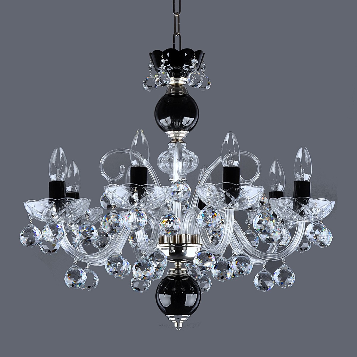 Zeitloser Kristallkronleuchter in einer Kombination aus schwarzem und klarem Kristallglas. Das kontrastreiche Design des Kronleuchters bringt Ordnung und Harmonie der Gegensätze von Schwarz und Weiß in den Raum, ähnlich wie Yin und Yang. Der Kronleuchter hat 8 massive, profilierte Arme, die mit geschliffenen Bleikristallkugeln verziert sind. Der kontrastreiche Effekt wird durch das silberglänzende Metall noch verstärkt, das die Leuchte edel und sauber erscheinen lässt.
